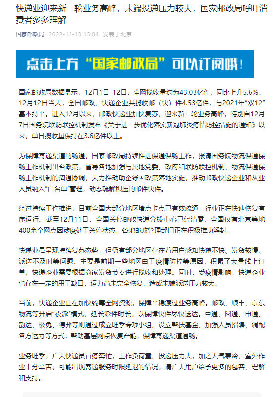 據(jù)“國家郵政局”公眾號(hào)13日消息,當(dāng)前,快遞企業(yè)正在加快統(tǒng)籌全網(wǎng)資源,保障平穩(wěn)渡過業(yè)務(wù)高峰。郵政、順豐、京東物流等開啟“夜派”模式,延長派件時(shí)長,以保障快件盡快送達(dá)。中通、圓通、申通、韻達(dá)、極兔、德邦等則通過成立旺季專項(xiàng)小組、設(shè)立幫扶基金、加強(qiáng)人員招聘、調(diào)配各方運(yùn)力等方式,幫助基層網(wǎng)點(diǎn)恢復(fù)產(chǎn)能,保障寄遞渠道通暢。(中新財(cái)經(jīng))