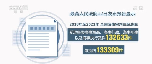 央視網(wǎng)消息:最高人民法院12月12日發(fā)布的《中國海事審判(2018—2021)》顯示,2018年至2021年,全國海事審判三級法院受理各類海事海商、海事行政、海事刑事以及海事執(zhí)行案件132633件、審執(zhí)結133309件。