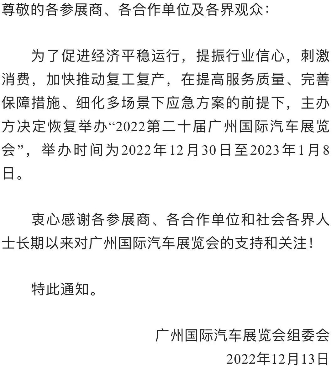 中新網(wǎng)12月13日電 據(jù)“廣州國際汽車展”公眾號(hào)消息,廣州國際汽車展覽會(huì)組委會(huì)12月13日發(fā)布通知,為了促進(jìn)經(jīng)濟(jì)平穩(wěn)運(yùn)行,提振行業(yè)信心,刺激消費(fèi),加快推動(dòng)復(fù)工復(fù)產(chǎn),在提高服務(wù)質(zhì)量、完善保障措施、細(xì)化多場景下應(yīng)急方案的前提下,主辦方?jīng)Q定恢復(fù)舉辦“2022第二十屆廣州國際汽車展覽會(huì)”,舉辦時(shí)間為2022年12月30日至2023年1月8日。(中新財(cái)經(jīng))