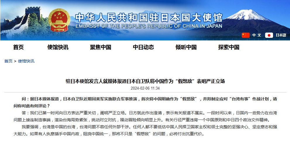 駐日使館就媒體報(bào)道日本自衛(wèi)隊(duì)將中國作為“假想敵”表明嚴(yán)正立場(chǎng)