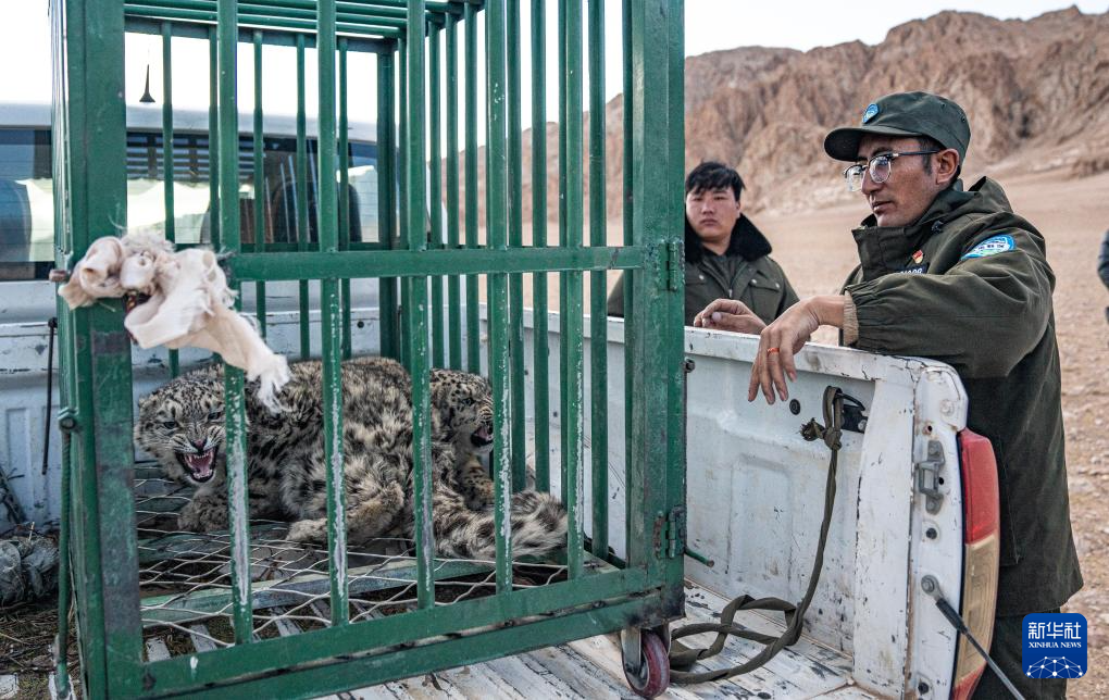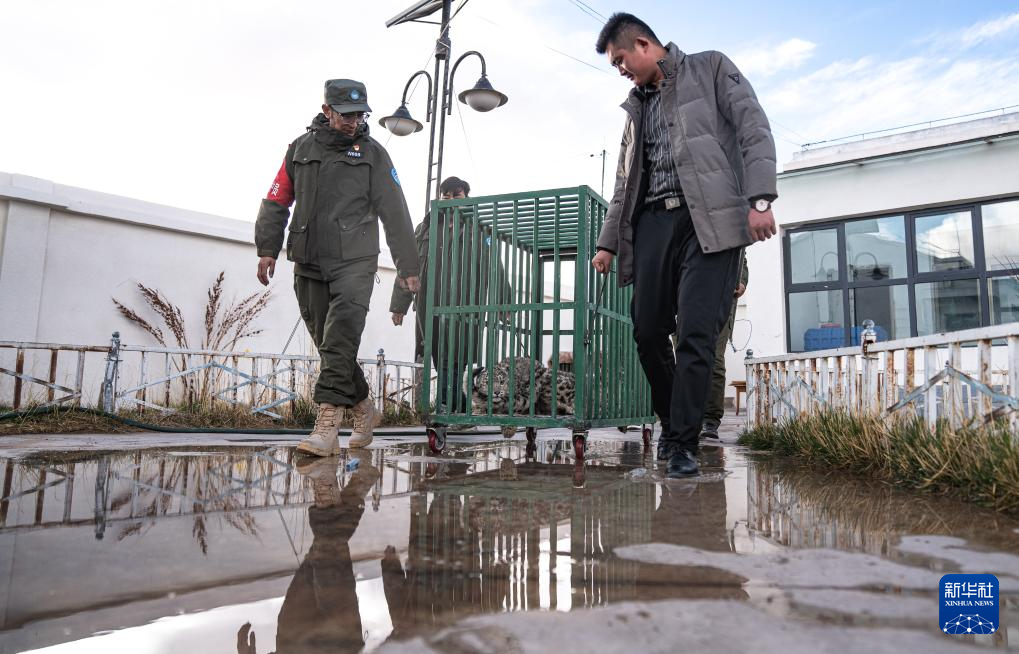尼瑪縣野生動物管護隊員在運送即將放歸自然的雪豹(5月13日攝)。新華社記者 丁增尼達 攝