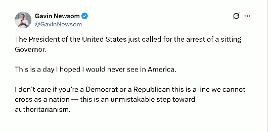 紐森9日上午在社交媒體發(fā)文說,特朗普竟然威脅要逮捕他,這種行為是美國“不能逾越的底線”。