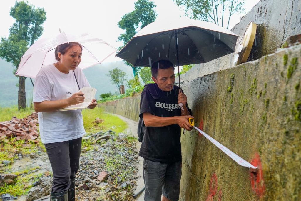 7月30日,富強(qiáng)村村黨支部書記謝小紅(左一)和地質(zhì)災(zāi)害監(jiān)測(cè)員魯業(yè)江(右一)一起對(duì)富強(qiáng)村一處地質(zhì)災(zāi)害點(diǎn)進(jìn)行測(cè)量和監(jiān)測(cè)。新華社記者 劉潺 攝
