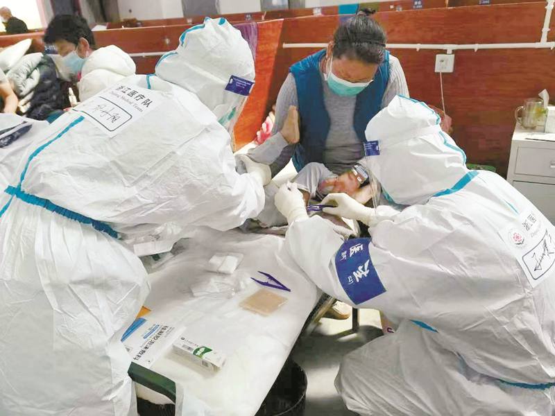 圖為浙江援藏醫(yī)療隊醫(yī)護人員在方艙內(nèi)對患者進行救治。 (浙江援藏醫(yī)療隊供圖)
