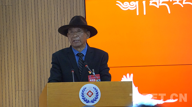 圖為慶祝西藏自治區(qū)人民醫(yī)院建院70周年大會(huì)上,醫(yī)院退休老同志仁青次旺發(fā)言 攝影:王媛媛