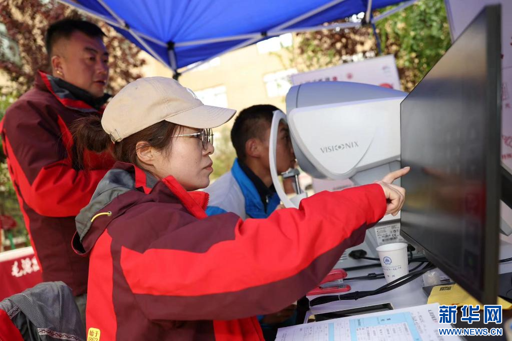 在西藏自治區(qū)那曲市色尼區(qū)第二中學(xué)(杭嘉中學(xué)),志愿者用綜合驗(yàn)光儀為學(xué)生驗(yàn)光(6月22日攝)。新華社發(fā)(趙穎碩 攝)