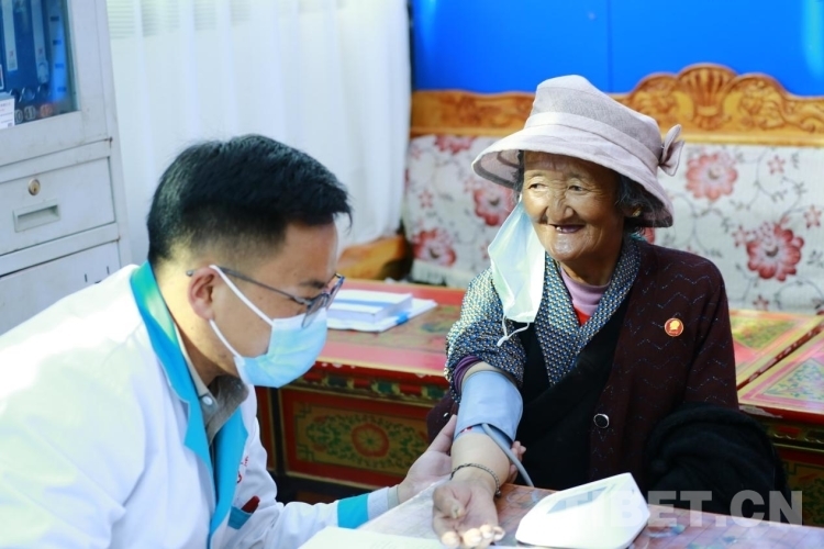 圖為亞東縣中心醫(yī)院醫(yī)護(hù)人員為老人測量血壓 圖源:帕里鎮(zhèn)四社區(qū)工作隊(duì)