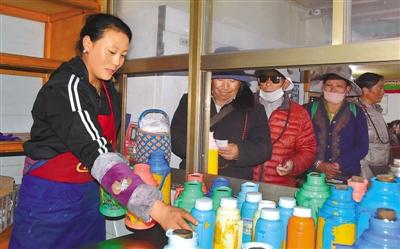 沖賽康“愛心飯館”位于拉薩老城區(qū)核心地帶,因“愛心飯館”飯菜量足、甜茶味道好,深受廣大居民群眾的喜愛。記者來(lái)到?jīng)_賽康“愛心飯館”時(shí),飯館內(nèi)早已座無(wú)虛席,每個(gè)窗口前都排滿了人,廚房?jī)?nèi)的工作人員更是忙得不可開交。“甜茶已經(jīng)賣完了,請(qǐng)稍等一會(huì)兒,我們馬上做。”服務(wù)員向客人說(shuō)道。