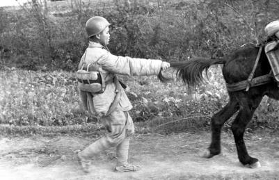 圖為解放軍第十八軍進(jìn)藏,途中疲勞的小戰(zhàn)士揪著馬尾巴前進(jìn)。袁克忠攝