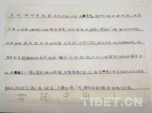 現(xiàn)在的我,是一名陽(yáng)光快樂(lè)的兒童,在學(xué)校,我努力學(xué)習(xí),團(tuán)結(jié)同學(xué),積極幫助他人,經(jīng)常參加學(xué)校組織的各項(xiàng)活動(dòng),你們的救助,不僅讓我得到快樂(lè)的童年,也讓我們一家人感到格外幸福,非常感謝你們,我一定努力學(xué)習(xí),做個(gè)對(duì)社會(huì)有用的人,祝你們新年快樂(lè),萬(wàn)事如意!也請(qǐng)你到若爾蓋到我家做客。