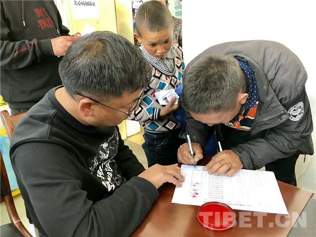 圖為扎西達娃(左)在確篩工作現(xiàn)場