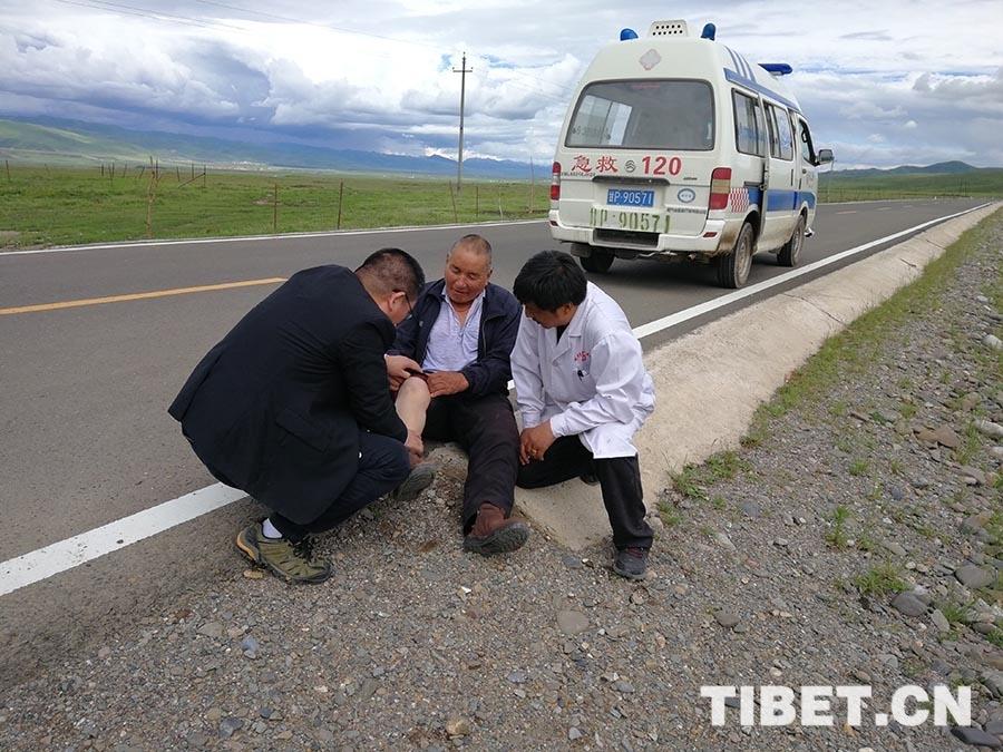 老人說自己的膝關(guān)節(jié)總是會疼,剛才在路邊站了一個多小時,腫脹疼痛更加嚴(yán)重。看到這種情況,來自北京市昌平區(qū)醫(yī)院的骨科主任王現(xiàn)海立即在公路邊開始診治。詢問病史及進(jìn)行體格檢查后,醫(yī)生診斷為右膝關(guān)節(jié)骨性關(guān)節(jié)炎。隨后與歐拉秀瑪鄉(xiāng)衛(wèi)生院院長楊河軍及其他專家一起將老人抬上救護(hù)車,讓他躺在救護(hù)車的擔(dān)架上,進(jìn)行了腰椎及髖關(guān)節(jié)的體檢,排除了腰椎及髖部疾患的可能。王現(xiàn)海輔導(dǎo)老人進(jìn)行針對膝關(guān)節(jié)骨性關(guān)節(jié)炎的康復(fù)鍛煉,建議其口服消炎止痛類藥物,并到上級醫(yī)院進(jìn)一步檢查明確病情。老人連忙稱謝。