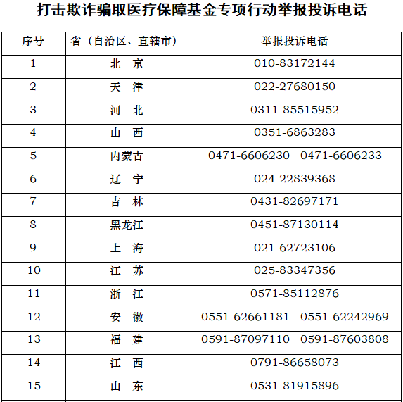 人民健康從國家醫(yī)保局獲悉,醫(yī)保局首次設立了國家級打擊欺詐騙取醫(yī)療保障基金專項行動舉報電話,并要求各地醫(yī)保部門建立舉報獎勵機制,同時對舉報嚴格保密,保護舉報人的合法權(quán)益。以群眾舉報為重點線索,結(jié)合醫(yī)保智能監(jiān)控、大數(shù)據(jù)分析、開展暗訪等方式,精準鎖定目標,嚴厲打擊違法違規(guī)行為。目前全國各級32個“回頭看”舉報投訴電話已全面開通(文末附目錄)。