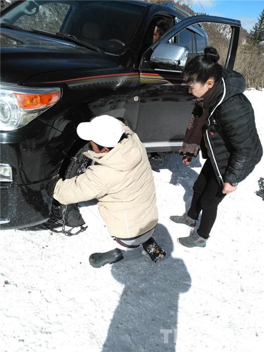 圖為工作人員正在為車輛加裝防滑鏈。攝影:崔志勇