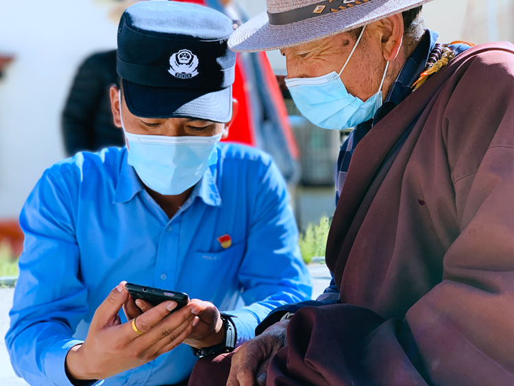 圖為在拉薩市林周縣一名黨員民警為老人講解“藏易通”的使用方法 攝影:何學兵
