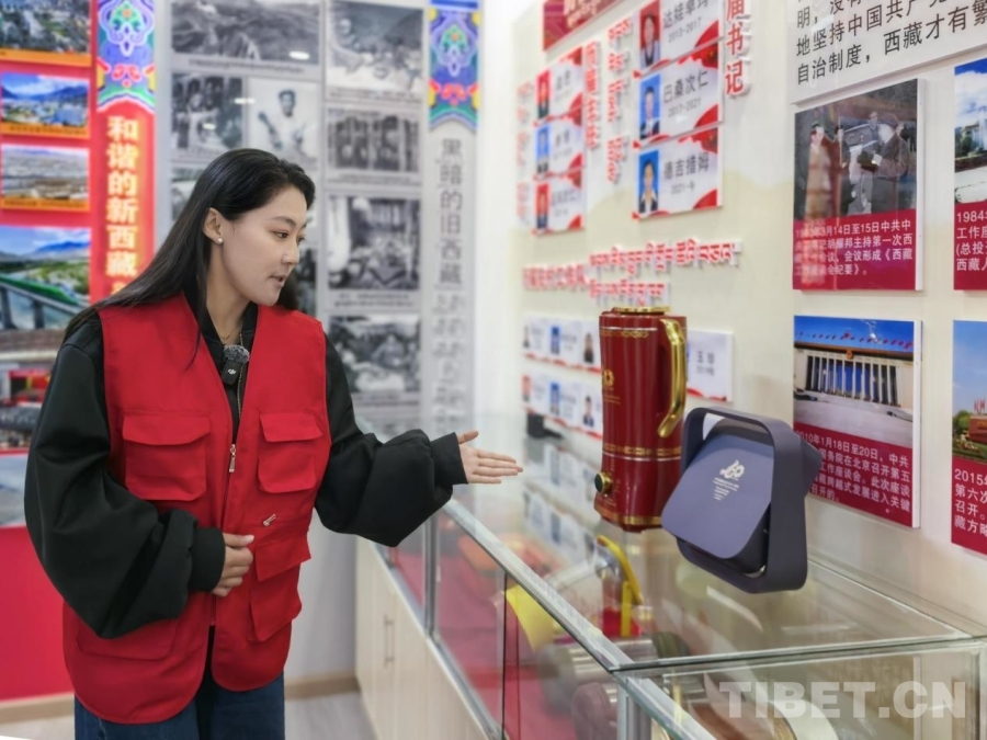 在社區(qū)回憶館內(nèi),有一排展柜精心展出了歷年來(lái)中央代表團(tuán)贈(zèng)予西藏各族各界干部群眾的禮物。從西藏自治區(qū)成立三十周年時(shí)的鐘表,到西藏自治區(qū)成立六十周年時(shí)的全自動(dòng)酥油茶壺,德吉措姆說(shuō)這些禮物滿(mǎn)載著黨中央對(duì)西藏各族群眾深情厚誼,每一件禮物都是當(dāng)時(shí)各族群眾日常生活所切實(shí)需要的,禮物的變化也見(jiàn)證著西藏各族群眾生活的變化。