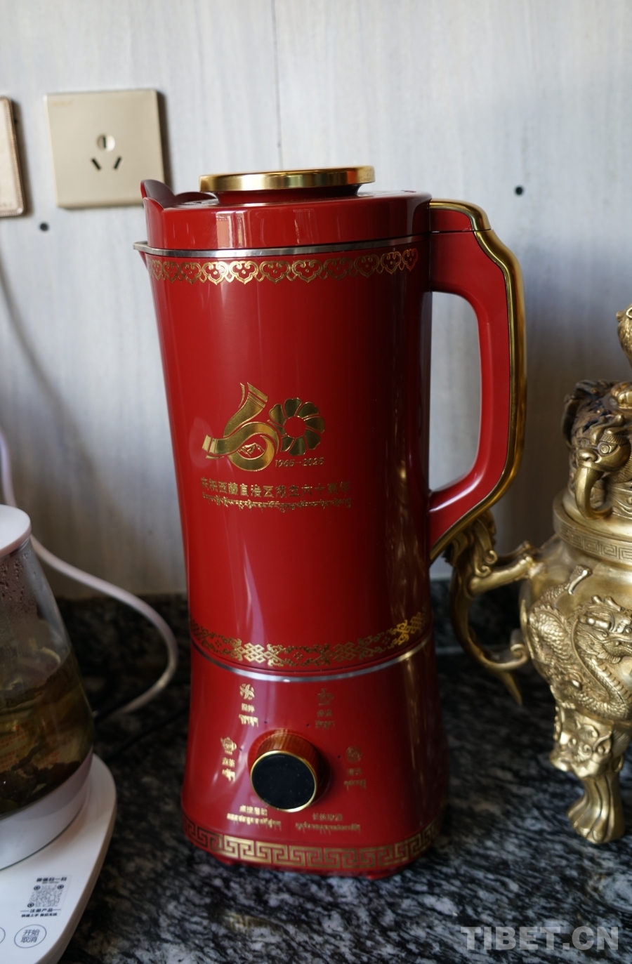 走進(jìn)客廳,茶幾上擺放著一臺(tái)紅色嶄新的全自動(dòng)酥油茶壺,機(jī)身上鐫刻著“慶祝西藏自治區(qū)成立60周年”的字樣。另一旁的展柜上,一套鎏金茶碗嶄新如初,仿佛能映出人影——那是2015年中央代表團(tuán)贈(zèng)送的西藏自治區(qū)成立50周年禮物。這些細(xì)節(jié),無不透露出主人對(duì)它的珍視。