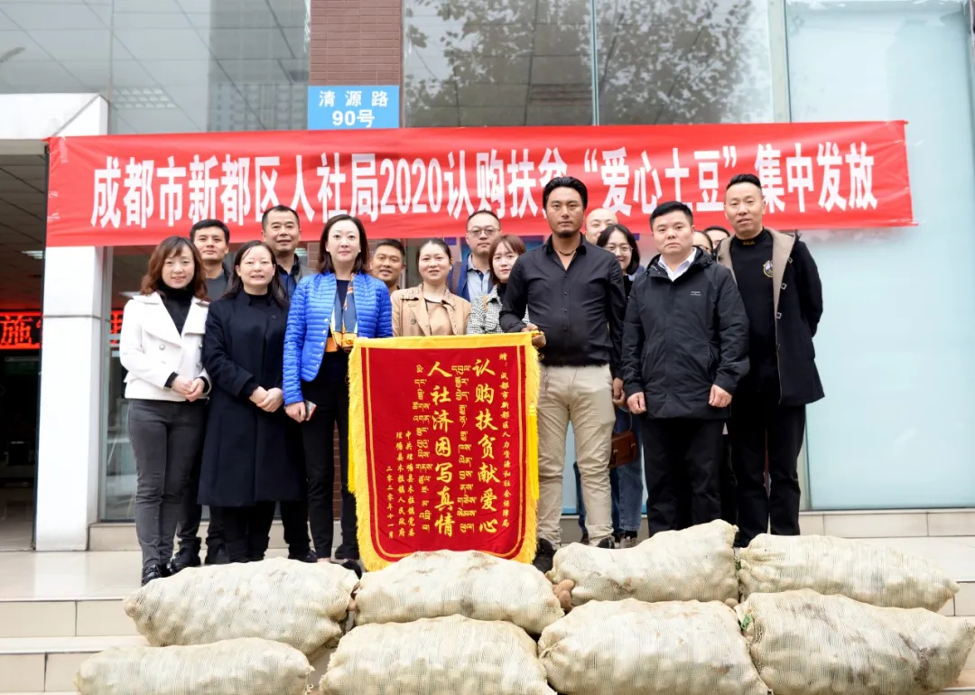 “感謝你們幫助認(rèn)購3萬余斤土豆……扎西德勒!”11月6日上午8點36分,來自理塘縣木拉鎮(zhèn)卡下村的“愛心土豆”車隊剛在新都區(qū)人社局停車場停穩(wěn),村長降央吉村一個躍步下車,為等候多時的人社局同志送上“認(rèn)購扶貧獻(xiàn)愛心、人社濟(jì)困寫真情”的錦旗。