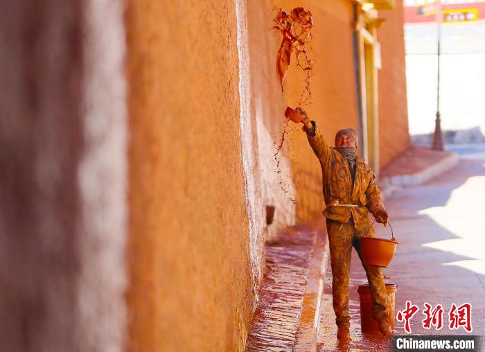 11月上旬,夏河縣拉卜楞寺內(nèi),匠人用傳統(tǒng)潑灑方法為寺院墻壁“美顏”。 高展 攝
