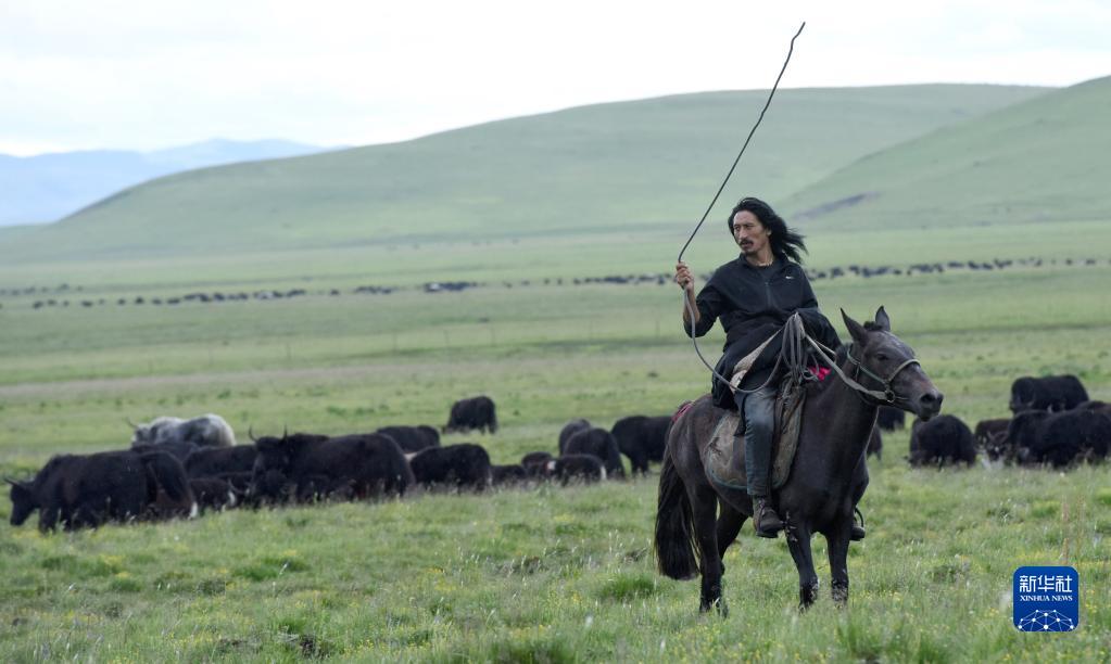 7月13日,羅日卓瑪在牦牛群中勞作。新華社記者 陳燮 攝