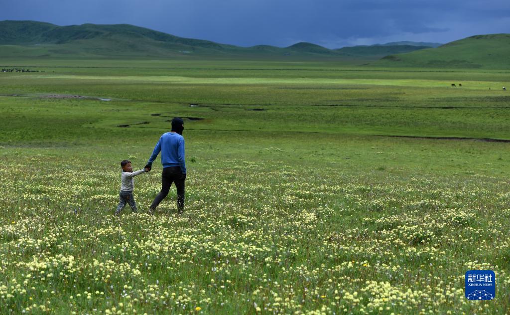 7月13日,巴周的女婿扎西拉著兒子走在家里的草場上。新華社記者 陳燮 攝