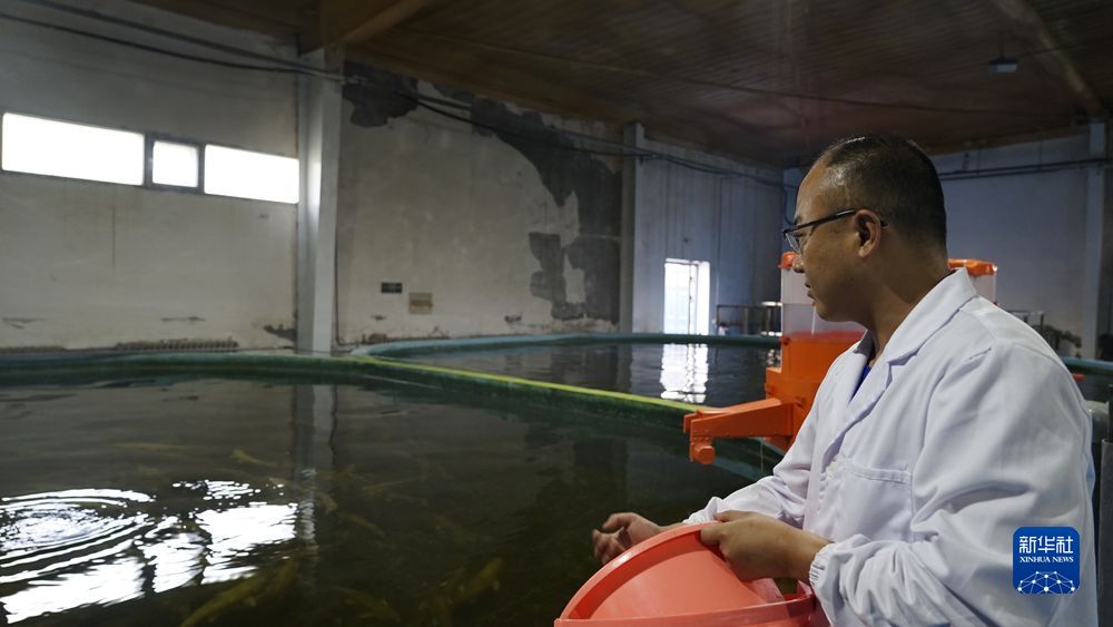 8月8日,青海湖裸鯉救護中心的工作人員為繁育車間里的湟魚喂食。新華社記者 陳杰 攝