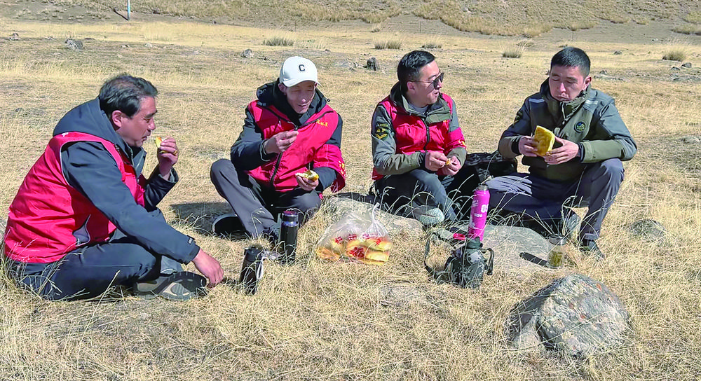 “我們巡護(hù)的路比較遠(yuǎn)也很難走,說(shuō)實(shí)話很辛苦,但在這個(gè)崗位上能最大限度保護(hù)國(guó)家公園的林區(qū)、草原和野生動(dòng)植物,心里非常自豪。”3月7日12時(shí)左右,上午的巡護(hù)暫時(shí)告一段落,祁連山國(guó)家公園邊麻管護(hù)站副站長(zhǎng)賈才讓東珠和同事席地而坐,從背包里掏出饃饃、開(kāi)水,吃起了午飯。