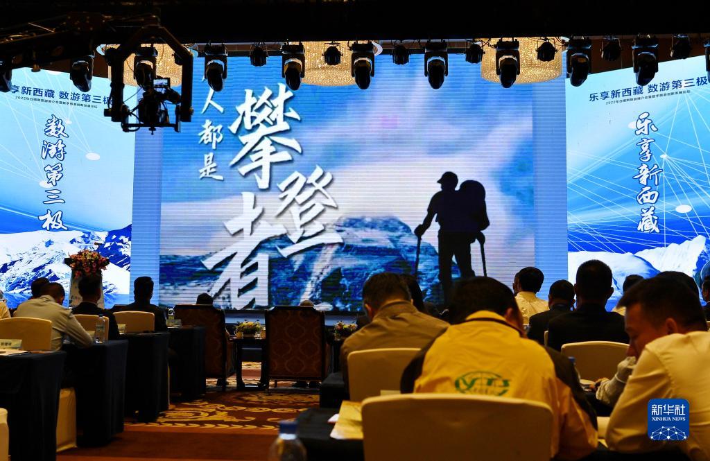 在2022年日喀則旅游推介會(huì)暨數(shù)字旅游創(chuàng)新發(fā)展論壇上播放的《當(dāng)旅行遇見(jiàn)珠峰》旅游微電影(7月15日攝)。新華社記者 張汝鋒 攝