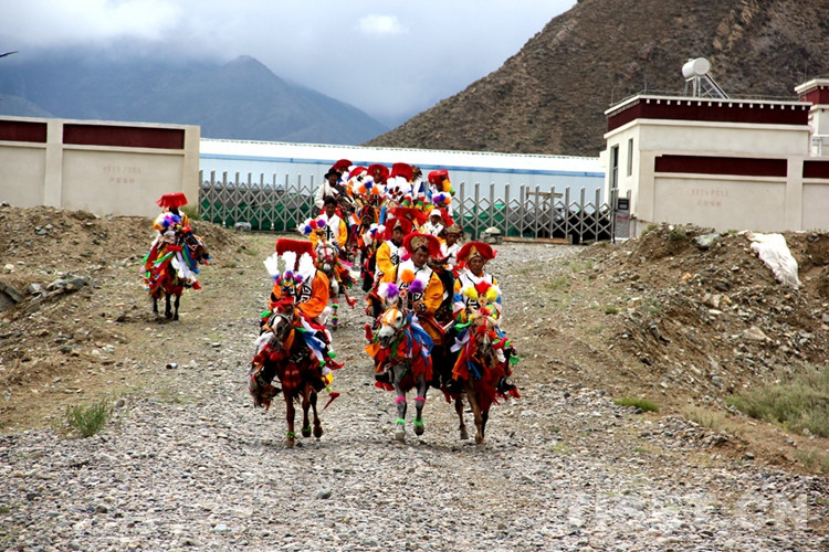 馬隊經(jīng)過農(nóng)田,帶去青稞黃熟的信號;繞過村舍,帶來豐收在望的喜悅;來到賽馬場,帶給村民們陣陣歡笑。一批批歡跳奔跑的“寶貝”馬,把馬背上騎手的喜悅揚上了天,而留在家中的村民也早早來到該村賽馬場,在場地邊上階梯觀眾席等候馬隊到來,以便納福迎瑞。