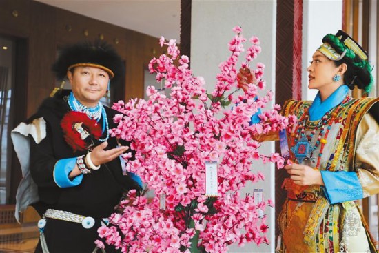 圖為推介會現(xiàn)場,工作人員對民族服飾進行展示。記者 格桑倫珠 李梅英 攝