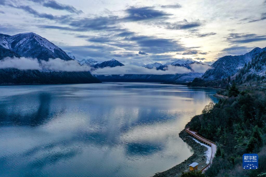 這是雪后拍攝的巴松錯(cuò)(無人機(jī)照片,2023年3月19日攝)。新華社記者姜帆 攝