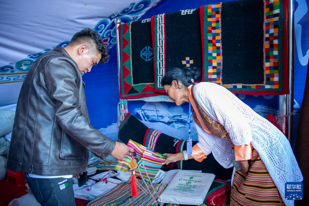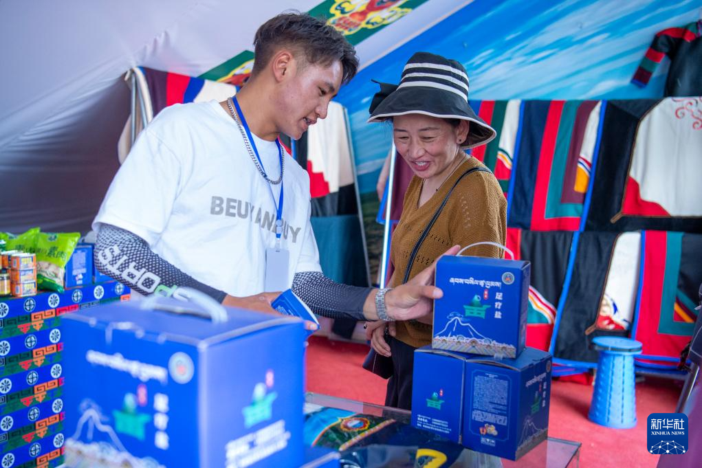 革吉縣鹽湖鄉(xiāng)羌麥村的村民旦真旺杰(左)在展銷會現(xiàn)場為顧客介紹產(chǎn)品(8月22日攝)。新華社發(fā)(旦增努布攝)