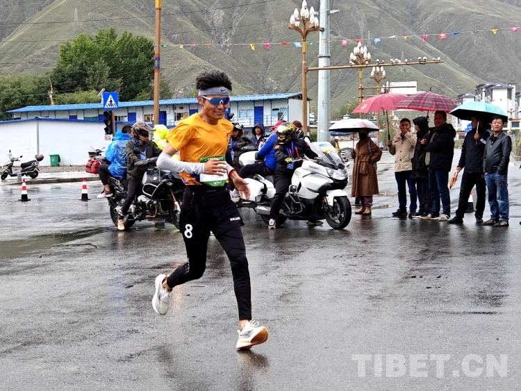 圖為競速跑11公里男子組第一名格桑旺堆抵達(dá)終點 攝影:次旦拉姆
