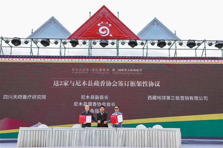 活動(dòng)當(dāng)天,為讓尼木藏香文化得以更好地傳承下去,尼木縣委副書(shū)記、縣長(zhǎng)次旺多杰為祖祖輩輩、世世代代用堅(jiān)守傳承文化的10位非遺傳承人授牌“致敬傳統(tǒng)手工藝人”。在集中簽約儀式上,天府香療研究院、西藏地球第三極營(yíng)銷有限公司與尼木縣簽訂戰(zhàn)略框架性協(xié)議,深度開(kāi)發(fā)藏香產(chǎn)業(yè);中國(guó)能源建設(shè)集團(tuán)西北電力建設(shè)工程有限公司、國(guó)家電投集團(tuán)西藏能源有限公司、北京能源國(guó)際控股有限公司、北京龍藝匯鑫科技有限公司四家企業(yè)與尼木縣人民政府簽訂框架協(xié)議,協(xié)議投資合計(jì)超150億元。