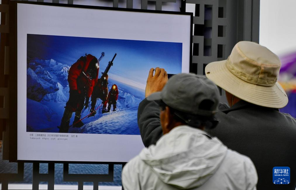 在拉薩市林周縣邊交林鄉(xiāng)當(dāng)杰村,人們?cè)谛蕾p第十六屆西藏珠穆朗瑪攝影大展作品(9月8日攝)。新華社記者 張汝鋒 攝