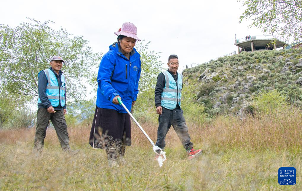 雅尼國家濕地公園管護(hù)員普布多杰(左)在巡護(hù)途中清理垃圾(9月8日攝)。新華社發(fā)(丁增尼達(dá) 攝)