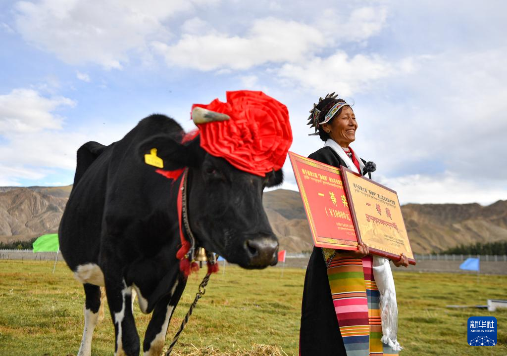 9月23日,獲得第一名的扎西央宗和她家的奶?!霸鳌焙嫌?。新華社記者 晉美多吉 攝