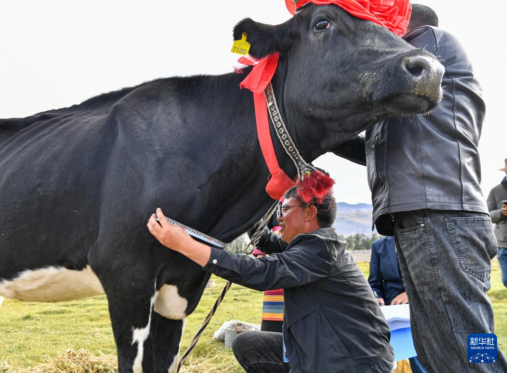 9月23日,工作人員測量參賽奶牛的體高、胸寬。新華社記者 晉美多吉 攝 ??
