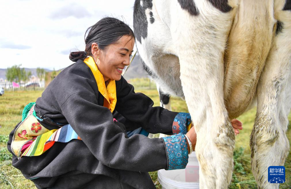 9月23日,參賽選手給參賽奶牛擠奶。新華社記者 晉美多吉 攝 ??