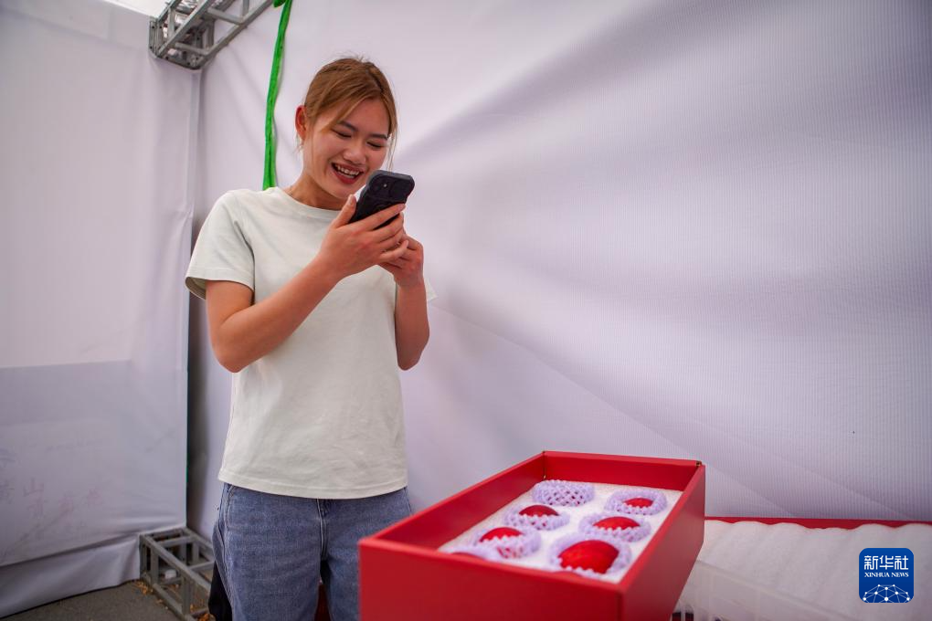 廖小明正通過網(wǎng)絡(luò)直播銷售“高原紅”蘋果。新華社記者 邵澤東 攝
