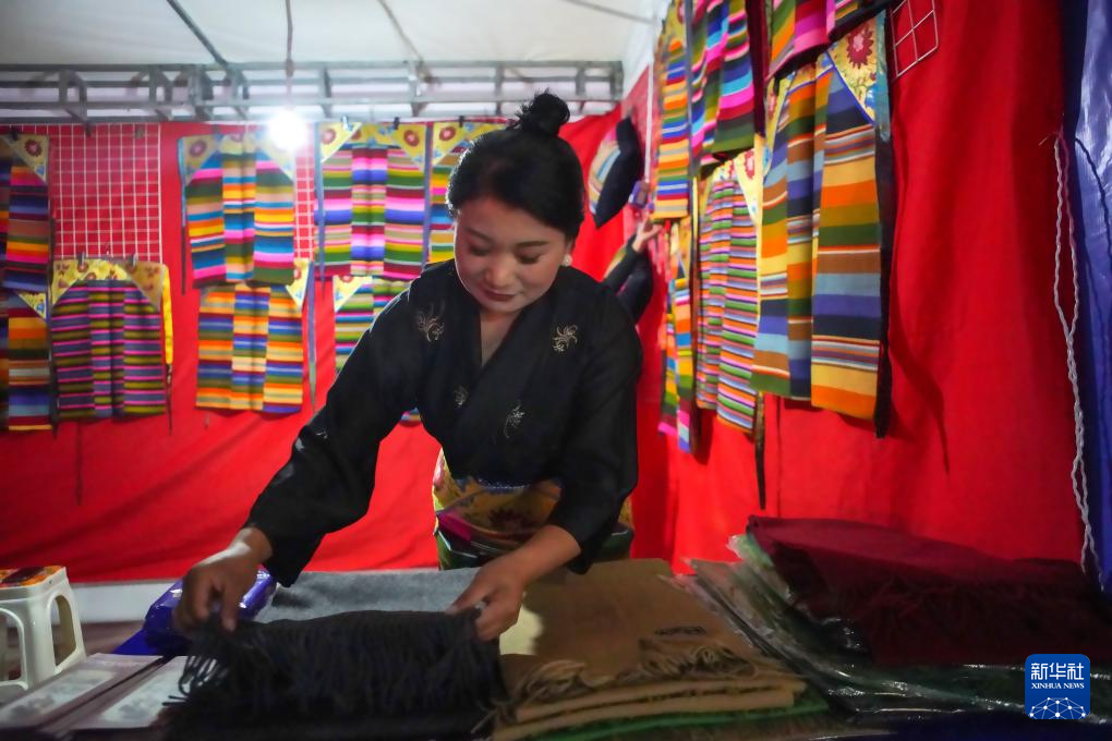 藏族邦典織造技藝傳承人旦增卓嘎在夜市中整理商品。新華社記者 邵澤東 攝