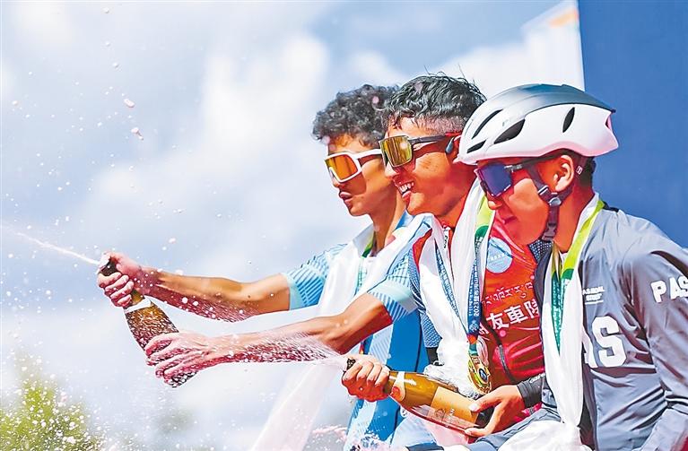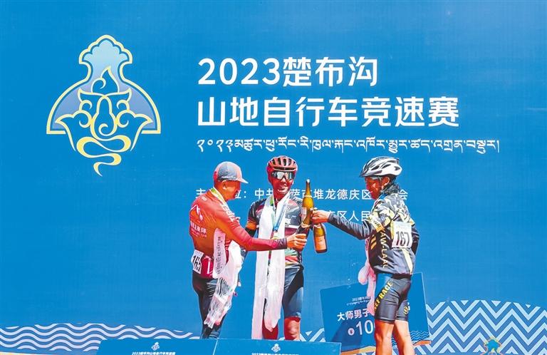 2023年堆龍德慶區(qū)宇妥文化旅游演出季·楚布溝山地自行車競(jìng)速賽頒獎(jiǎng)典禮上,選手在慶祝獲獎(jiǎng)。