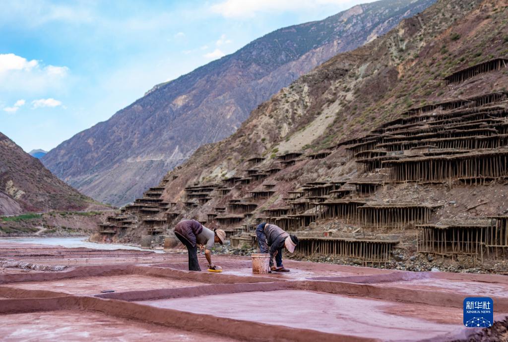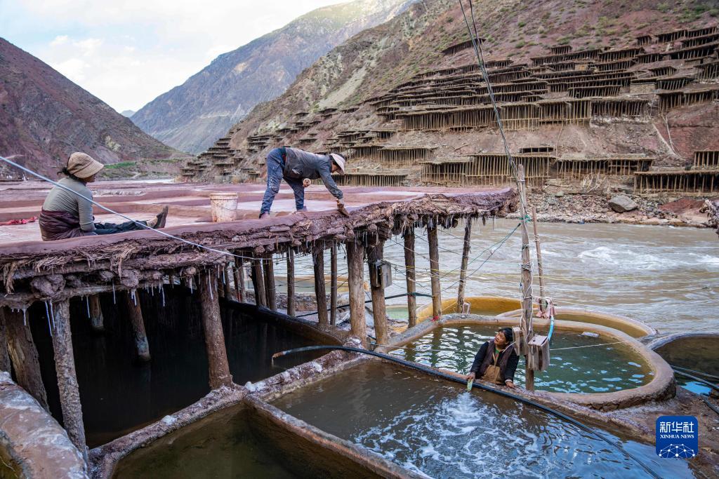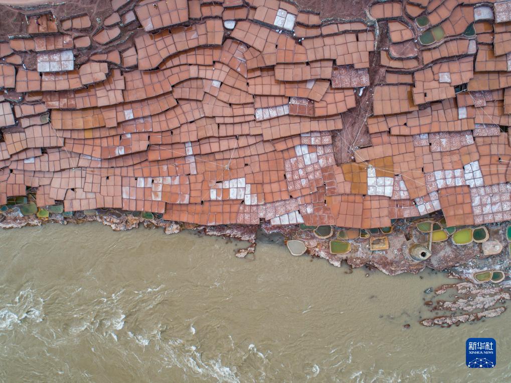 西藏昌都市芒康縣納西民族鄉(xiāng)位于瀾滄江畔,當?shù)貜奶拼_始制鹽,距今已延續(xù)1300余年。鹽田在瀾滄江兩岸依山而建,由多根木柱搭架,架上用透水性強的泥土鋪成平面夯實。當?shù)卮迕袢员3种嫉氖止覃}方式,他們從瀾滄江畔的鹽井、鹽池中取出鹵水倒入鹽田,經(jīng)陽光蒸曬、風干,結晶成鹽。遠遠望去,鹽田錯落有致,景色奇美。