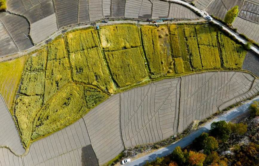 錯(cuò)落有致的金色稻田,呈現(xiàn)出一派豐收的景象。