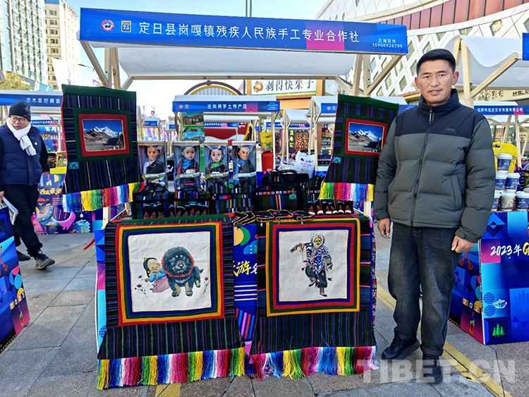 圖為定日縣崗嘎鎮(zhèn)殘疾人民族手工業(yè)專(zhuān)業(yè)合作社工作人員索朗次仁在自己的展臺(tái)前留影