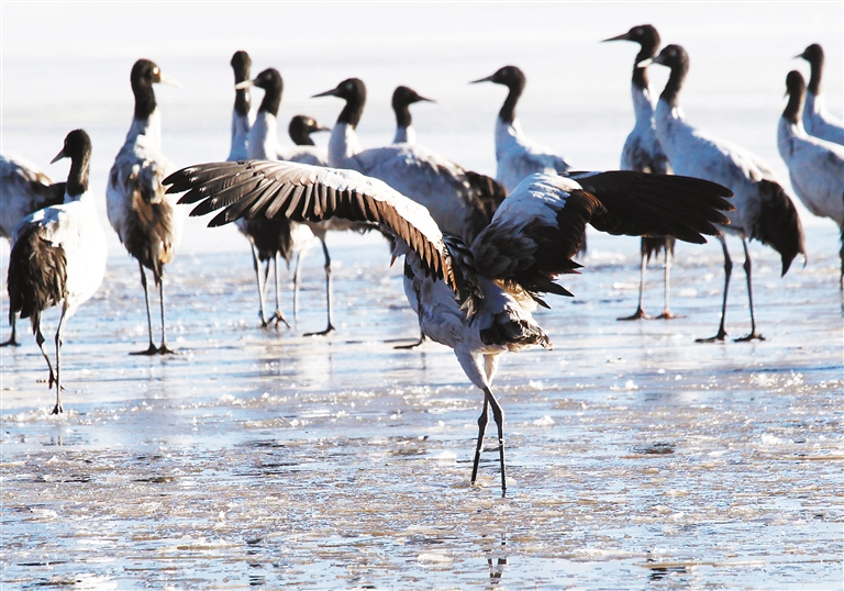 一群黑頸鶴在拉薩市林周縣濕地里嬉戲。本網(wǎng)記者 姚海全 攝