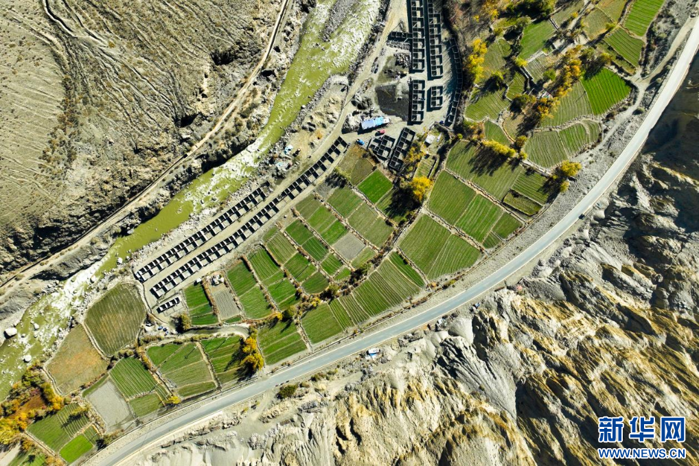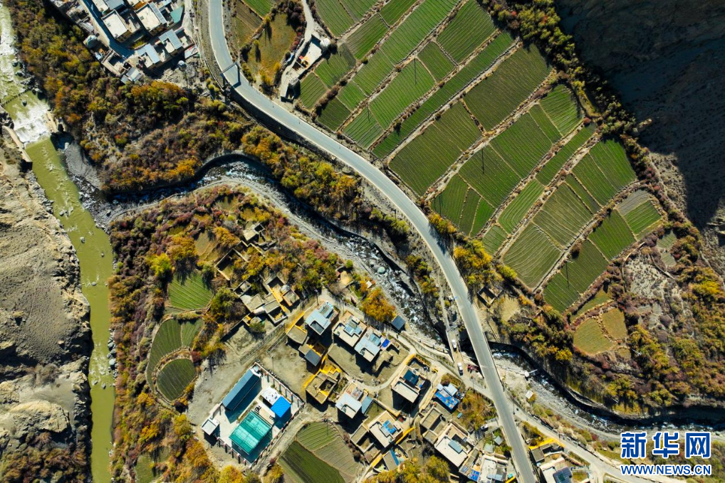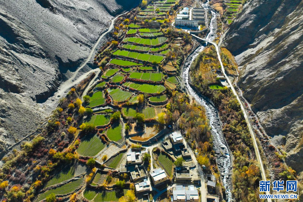 11月16日,西藏隆子縣加玉鄉(xiāng)境內(nèi)拍攝的村莊與農(nóng)田(無人機照片)。新華網(wǎng) 柑丹鴦琦 攝